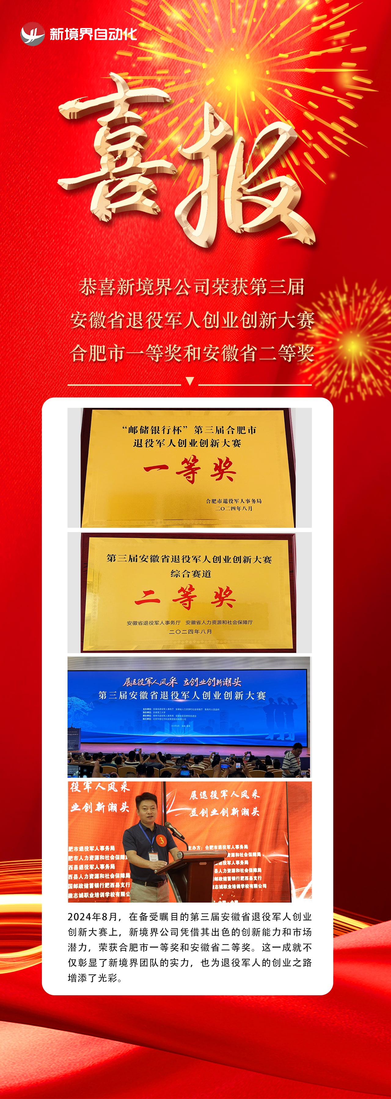 恭喜新境界公司榮獲第三屆安徽省退役軍人創(chuàng)業(yè)創(chuàng)新大賽合肥市一等獎(jiǎng)和安徽省二等獎(jiǎng)
